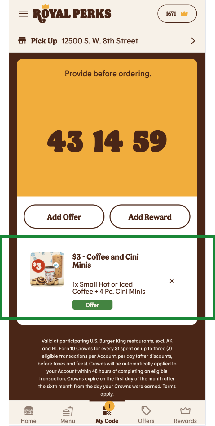 You can redeem eligible offers from the BK® App during an in-restaurant visit by adding the eligible offer to your account and providing your 6-digit “My Code” to the cashier before placing your order. This will ensure you earn Crowns and/or redeem your offer where available *.