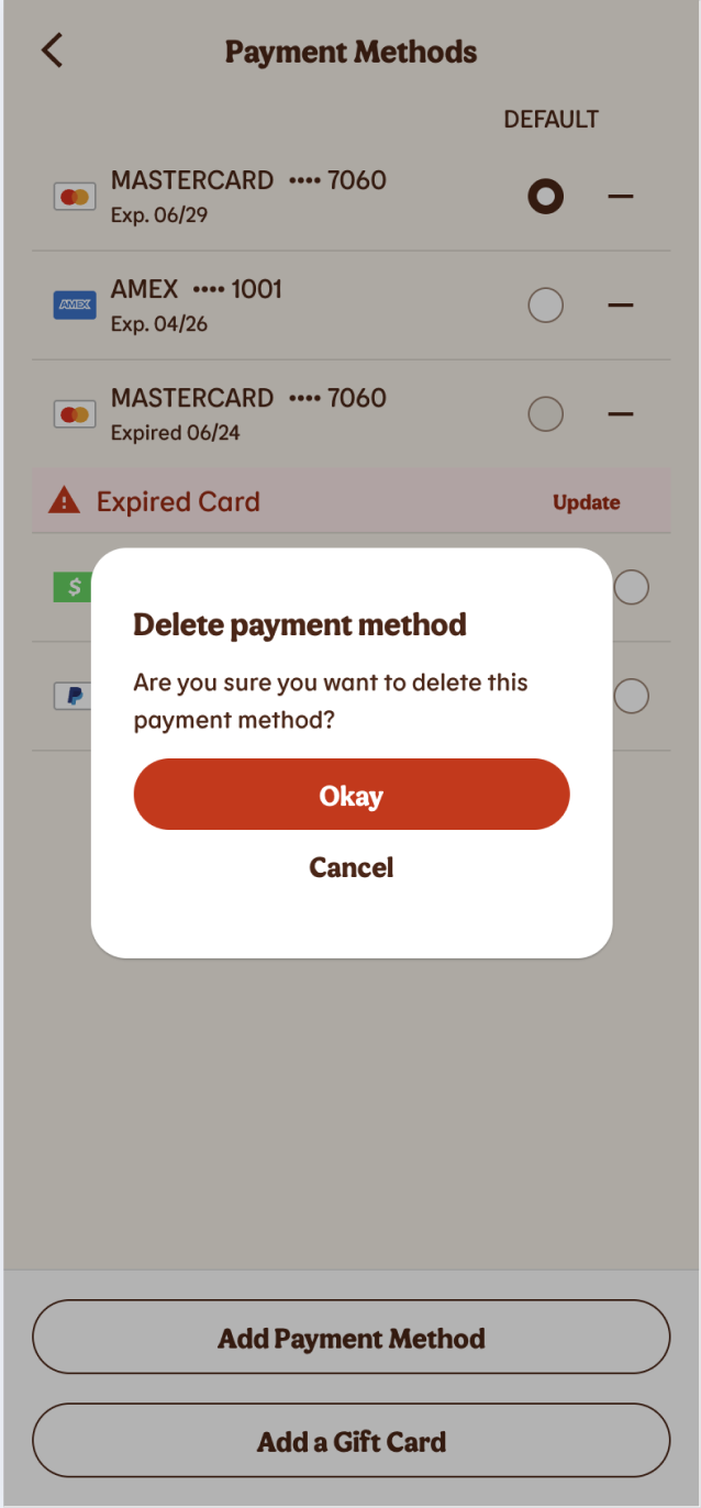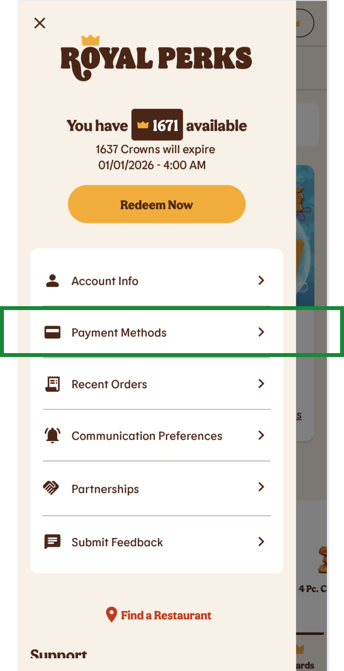You can easily add or remove a credit or debit card from your BK® Account by following these steps: