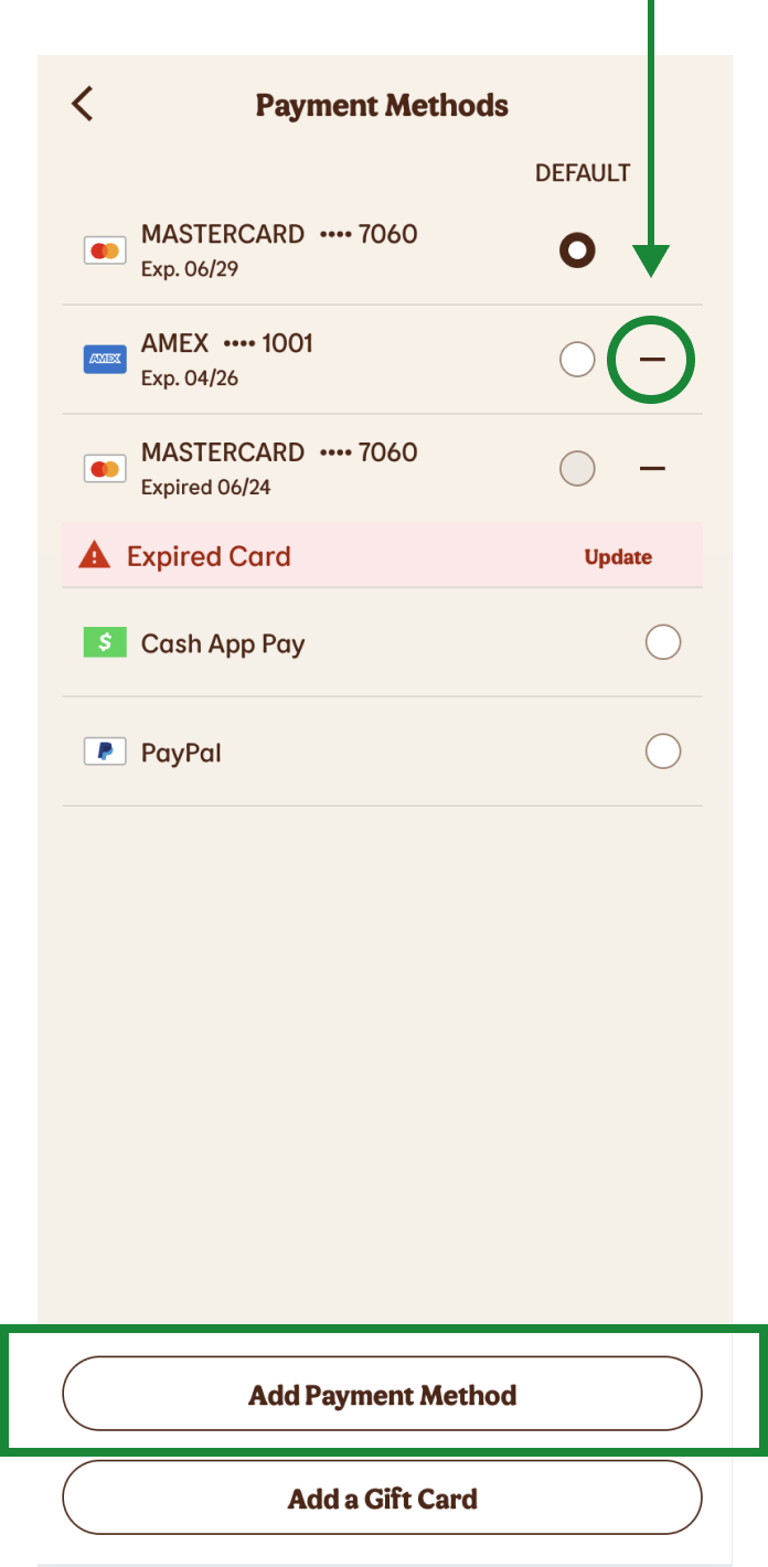 - To add a card, select “Add Payment Method”.